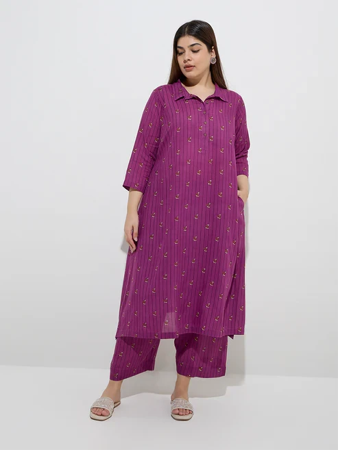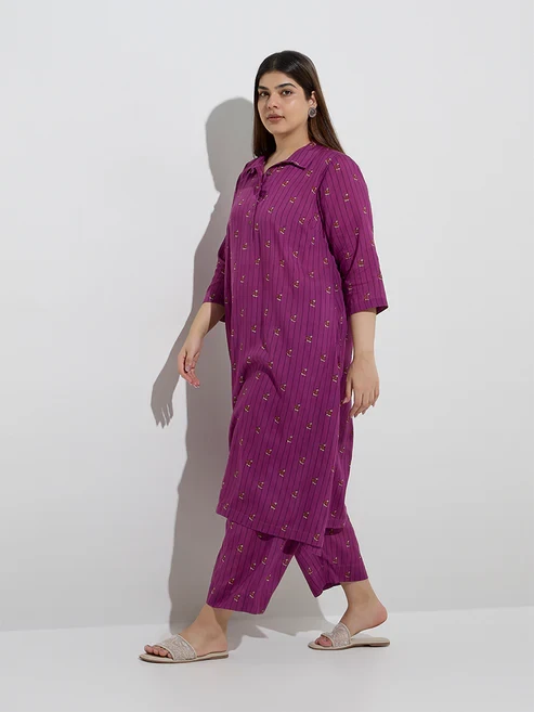 This plum co-ord set from Diza is tailored in an A-line silhouette from an ultra-lightweight fabric for all-day comfort. Featuring a mix of stripes and floral motifs, it is designed with a spread collar, three-quarter sleeves, and functional side pockets.