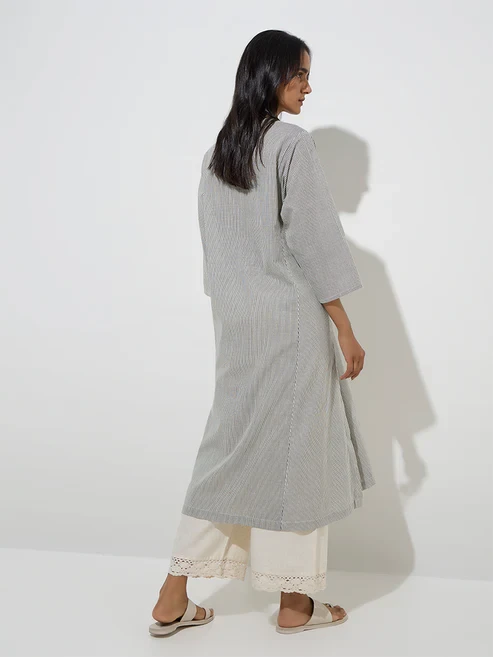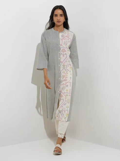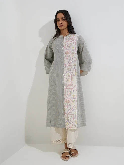 Utsa launches this black A-line kurta adorned with stripe patterns and elevated by a contrasting Jamdani-printed panel for a refined appeal. Woven from a cotton-rich fabric, it features a band-neck collar that extends into a button-up front and is finished with three-quarter sleeves.