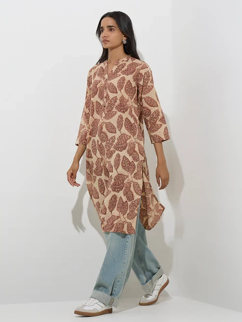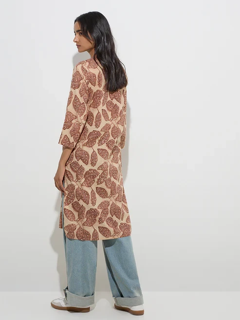This kurta from Utsa showcases an earthy beige base adorned with brown botanical prints for a nature-inspired charm. Spun from pure cotton for breathable comfort, it is styled with a mandarin neckline that flows into a button placket and finished with three-quarter sleeves for a refined silhouette.