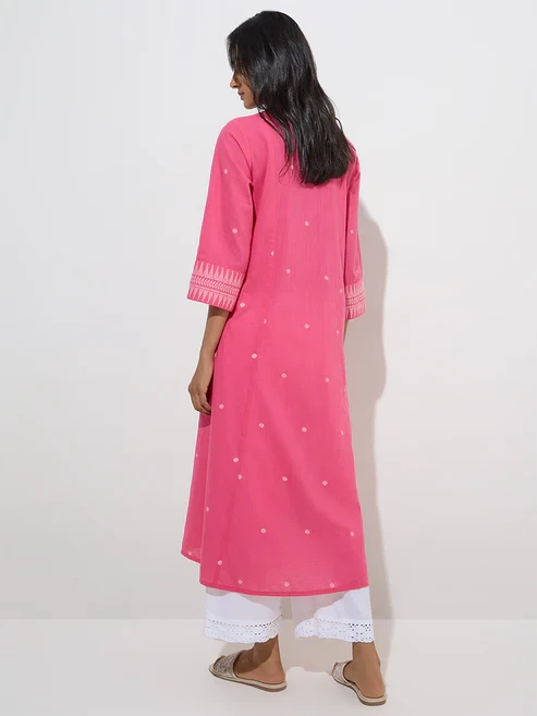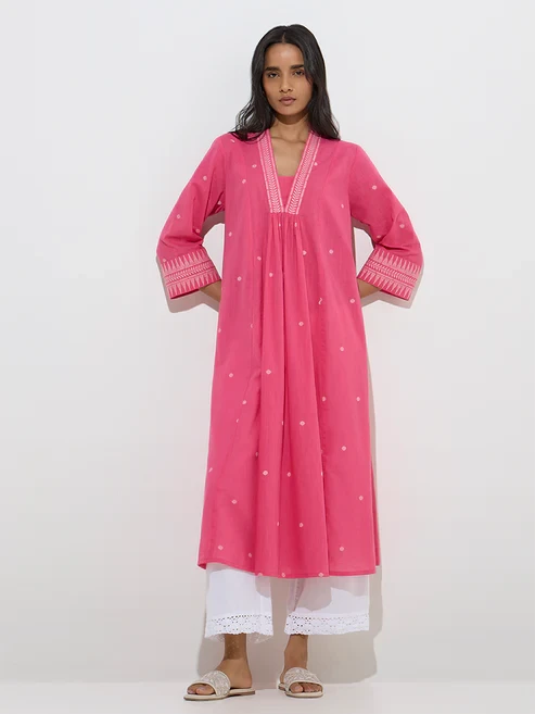 This pink kurta from Utsa is crafted from pure cotton and tailored in an A-line silhouette. Showcasing subtle badla prints, it features a V-neck with embroidered detailing and is finished with three-quarter sleeves.