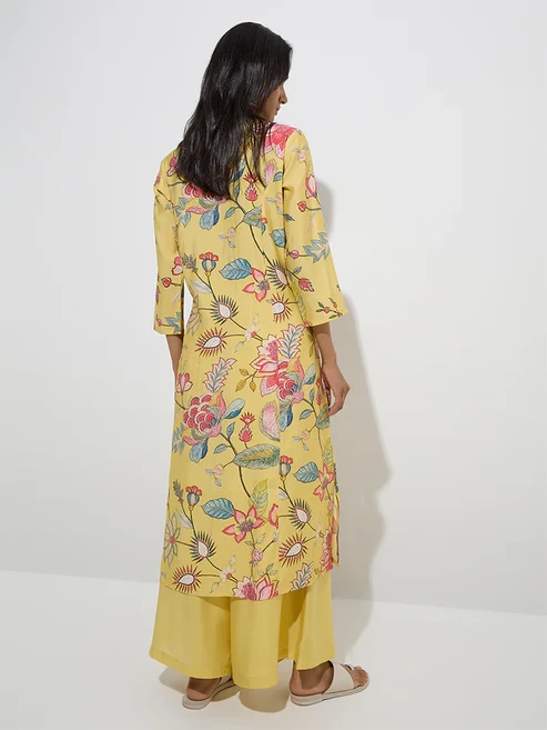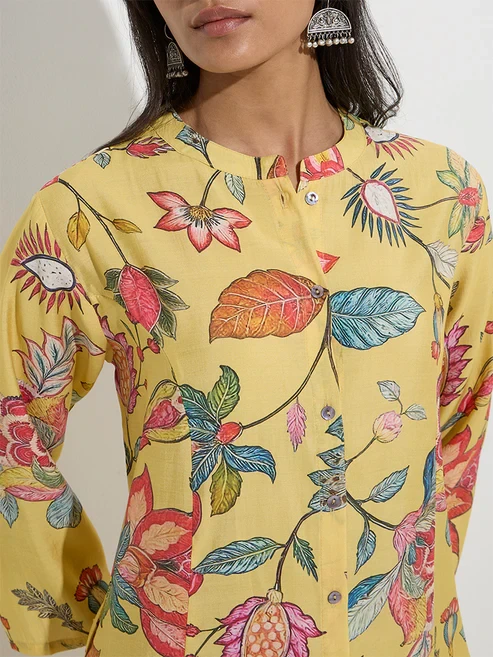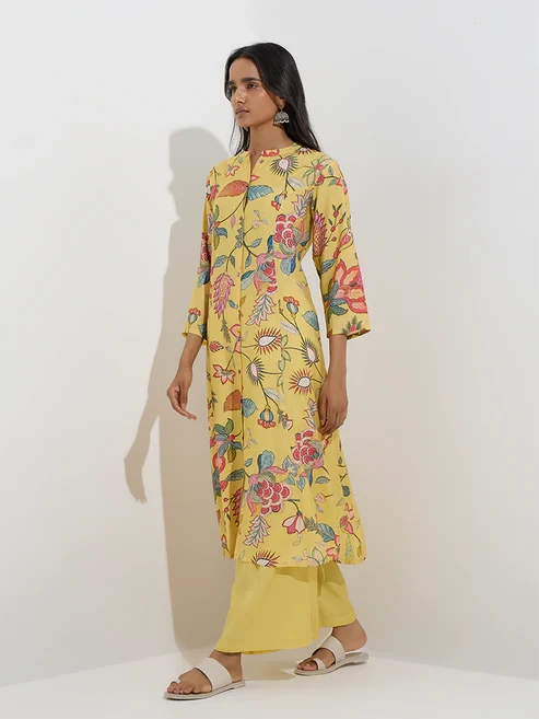 Shaped in an A-line silhouette, this yellow kurta from Utsa is defined with vibrant floral prints for a charming touch. It’s crafted from an ultra-lightweight fabric and finished with a band-neck collar that extends to a button placket, and three-quarter sleeves. The slip pockets lend a practical touch.