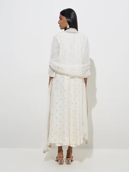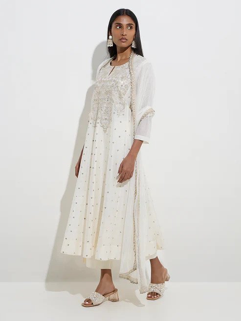 Exuding reality and timeless grandeur, this off-white ethnic set from Vark is adorned with exquisite embellished detailing. The A-line kurta features a split neck and three-fourth sleeves, offering a graceful silhouette. Paired with palazzos and a net dupatta adorned with zari trims, this ensemble is a true statement of elegance.