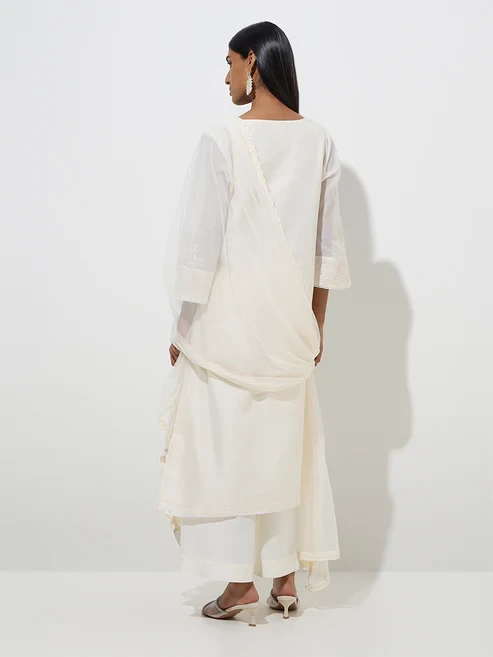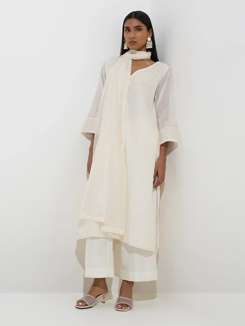 Embrace ethereal elegance with this white kurta set from Vark, tailored from a luxurious blended-cotton fabric. Shaped in a graceful A-line silhouette, the kurta is adorned with intricate floral embroidery, enhanced by a flattering V-neck and three-quarter sleeves. It is paired with flowy palazzos for effortless movement, while a delicate net dupatta with a crochet-trimmed border adds the perfect finishing touch.