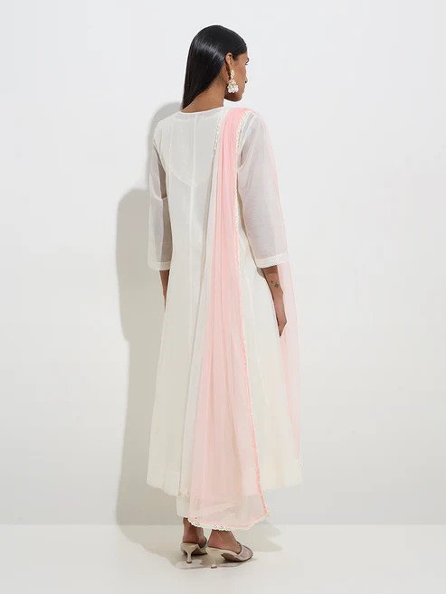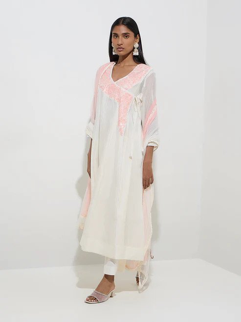 Blending grace with tradition, this white ethnic set from Vark features a beautifully embellished angrakha kurta adorned with intricate floral detailing. Crafted from a rich cotton blend, it is styled with a flattering V-neck and three-fourth sleeves for an elegant silhouette. The set is complete with coordinating ethnic pants featuring an elasticated waistband for comfort and a net dupatta, finished with a delicate crochet-embroidered hemline for a refined touch.