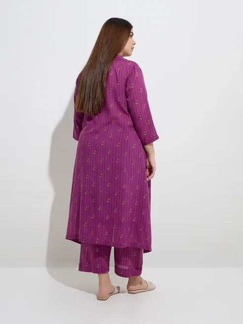 This plum co-ord set from Diza is tailored in an A-line silhouette from an ultra-lightweight fabric for all-day comfort. Featuring a mix of stripes and floral motifs, it is designed with a spread collar, three-quarter sleeves, and functional side pockets.