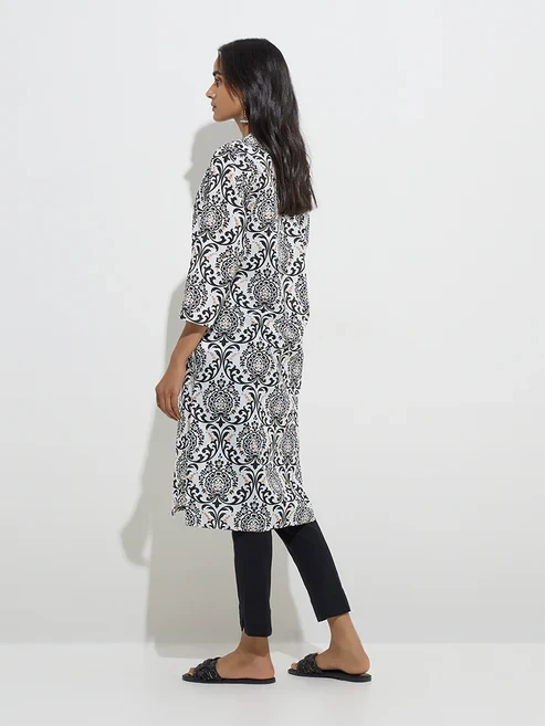 This black kurta from Utsa is woven from a cotton-rich fabric and showcases Mughal-inspired prints for a traditional yet timeless appeal. Tailored in a straight silhouette, it features a mandarin neckline that extends to a short button placket, while three-quarter sleeves complete the look.